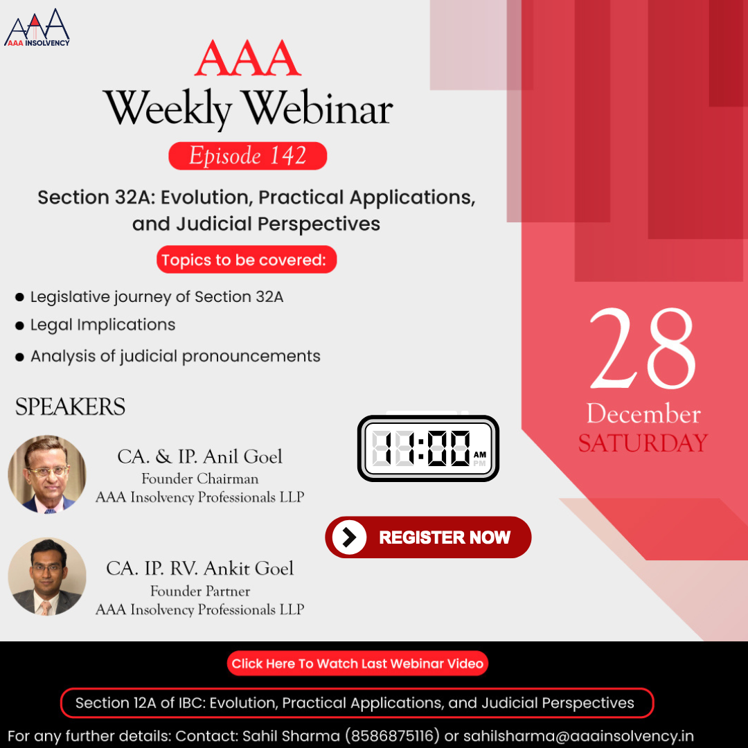 Join us for our weekly webinar series on IBC, Valuation and SARFAESI, every Saturday at 11am During these informative sessions, we will explore the latest trends and best practices in the fields of the Insolvency and Bankruptcy Code (IBC), Valuation and SARFAESI. Our expert presenters, CA Anil Goel and CA Ankit Goel, will provide valuable insights and answer your questions in real-time. Don't miss out on this unique learning opportunity. Register now and mark your calendars for our upcoming webinars! |