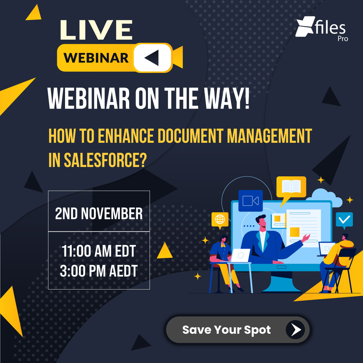 Register now to learn; What is document management in Salesforce? What are the challenges? What are the available options to manage documents efficiently in Salesforce? How to leverage the best document management systems for Salesforce using XfilesPro? Top 5 key aspects of document management success Please use the below links to register for the webinar: APAC | 3:00 PM AEST: https://meet.zoho.in/slqOS56I7Q US & EU | 11:00 AM EDT:https://meet.zoho.in/MuAI6JmYwJ |